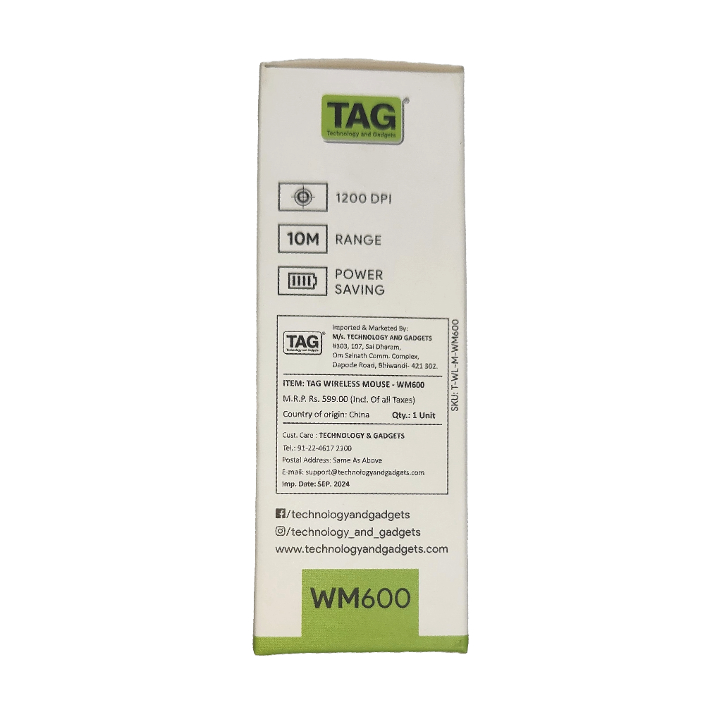 Be the first to review “TAG WM600 Wireless Mouse | 1200 DPI Optical Sensor | 2.4 GHz USB Nano Receiver Connectivity | 10m Range | Ergonomic Design | Plug and Play Usage | Compatible with PC, Laptop, Mac (White), 1 MB”